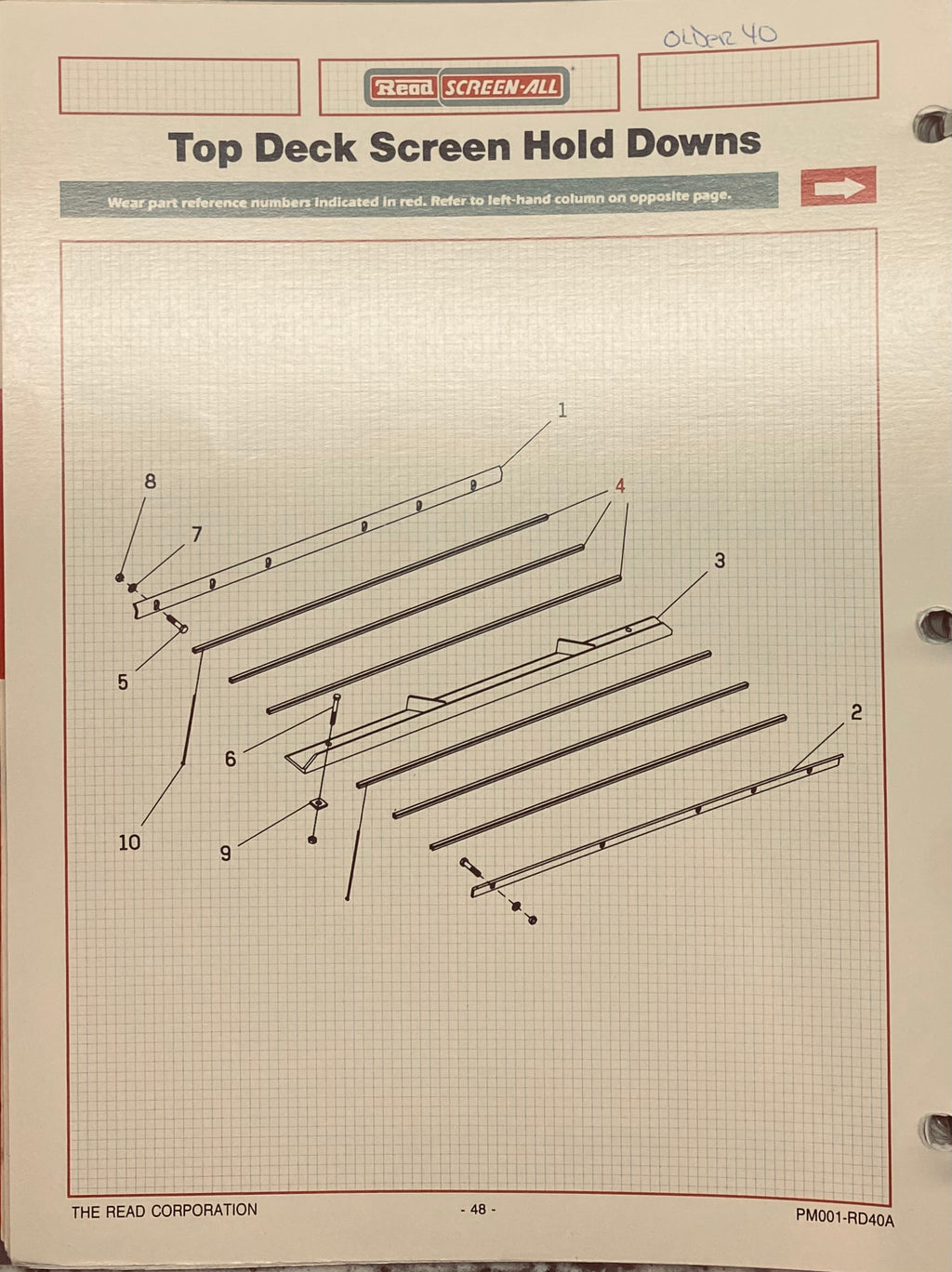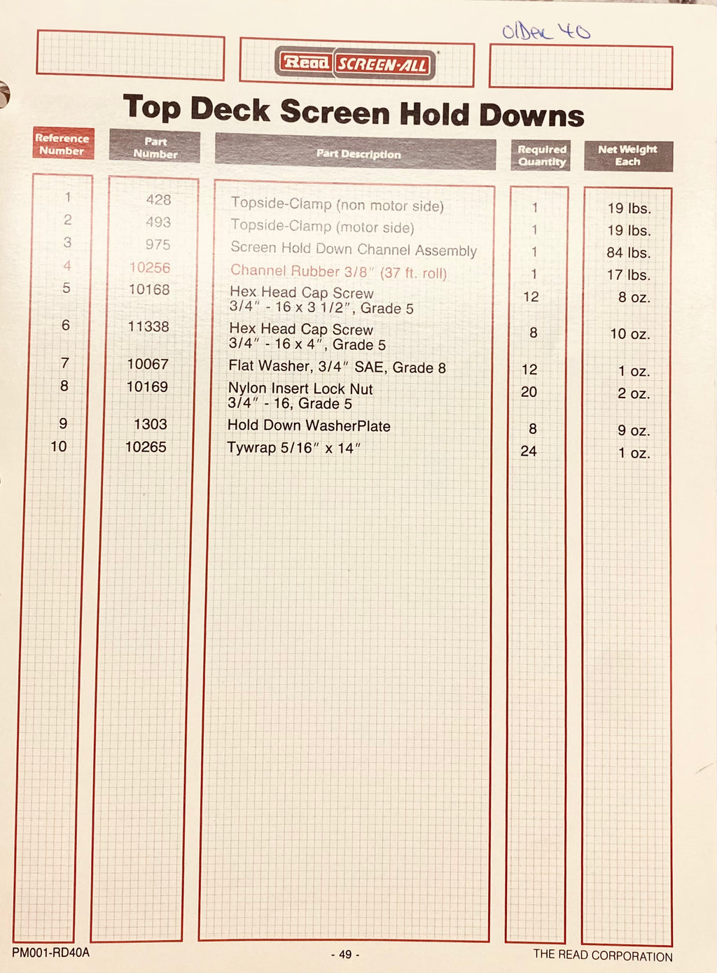 HD40ATD, Side clamps and center hold down used on the top deck of a RD 40A Read Screen. Part numbers 428, 493 and 973. Part number 10256 is the rubber channel and a 37 foot roll is included.